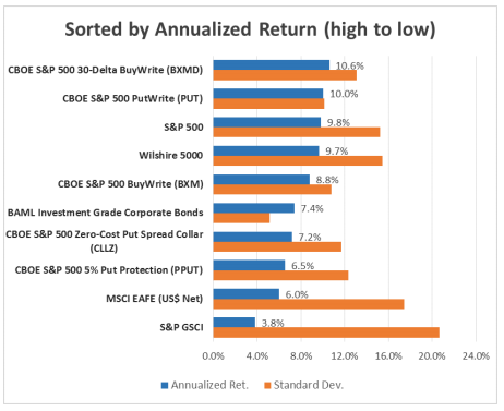 Como vocês podem notar, as duas primeiras estratégias, que são de venda de opções performaram melhor que o buy and hold simples de SP500. A barra azul do gráfico representa os retornos anualizados nesses 30 anos, já a barra laranja representa a volatilidade (ou risco) da estratégia. Claramente estratégias simples com opções como a venda coberta bateram o mercado nos últimos 30 anos e entregaram mais rentabilidade com menos risco.